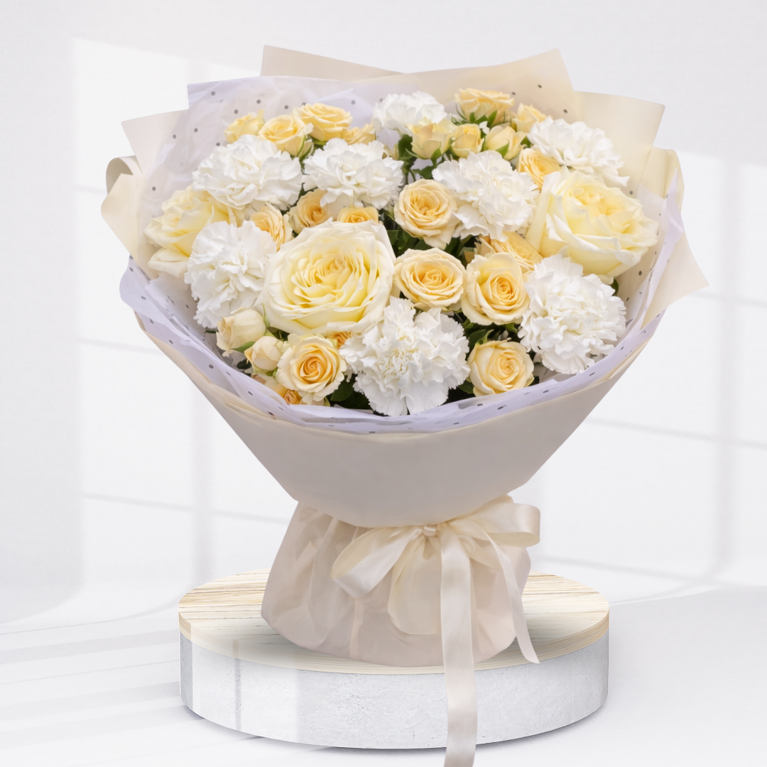 7 stems spray rose off- white 8 stems carnation white 3 stems Athena white With elegance wrapping